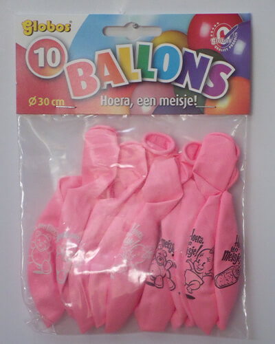 zakje met 10 ballons no. 12, rose, bedrukt met Hoera een meisje