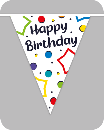 Papieren slinger met opdruk “Happy Birthday”.
